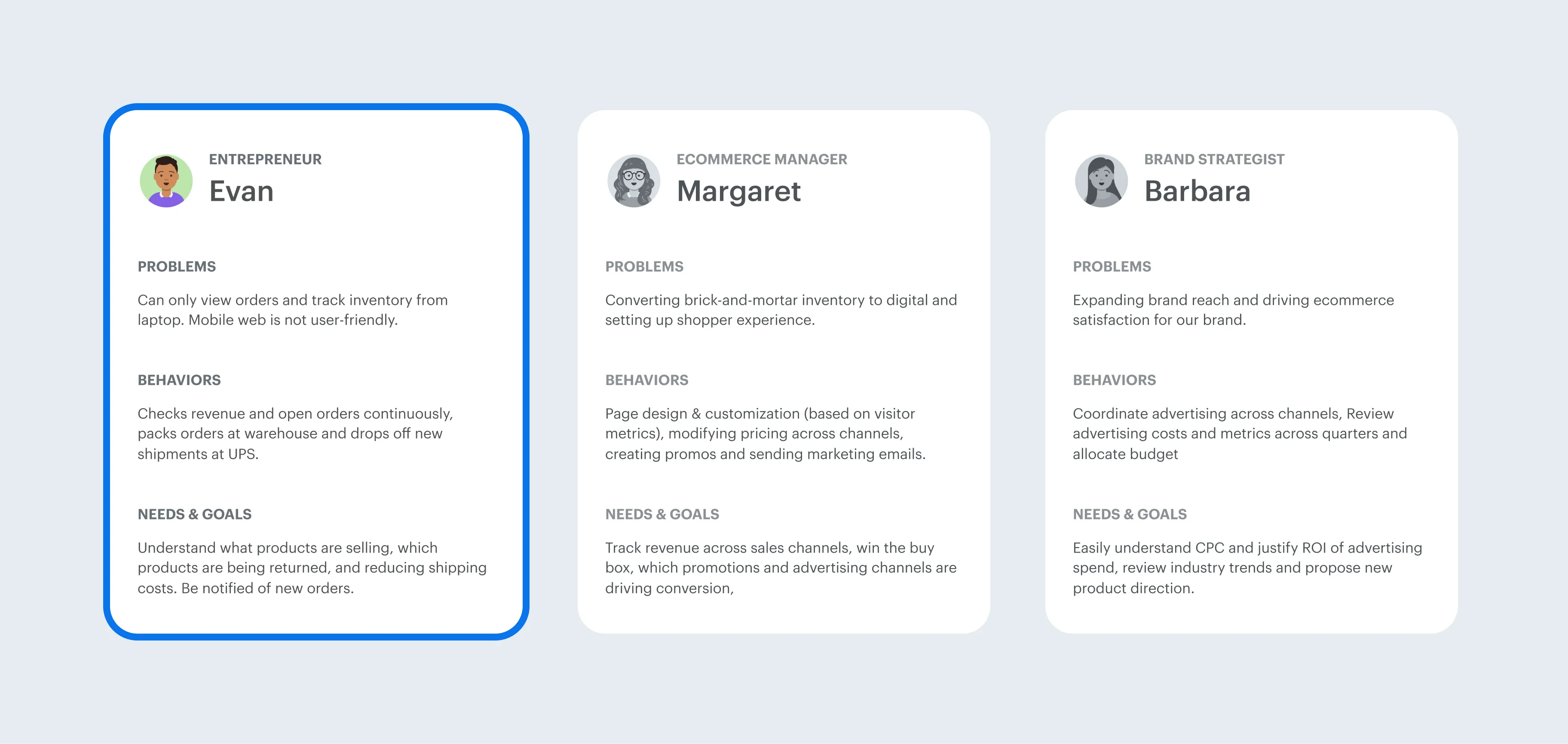 I conducted stakeholder interviews with members of the team to understand Cart.com’s various user types and distilled them into these proto-personas to be able to ensure the features we focused on for the mobile app were aligned to practical use-cases for the proto-persona Evan.