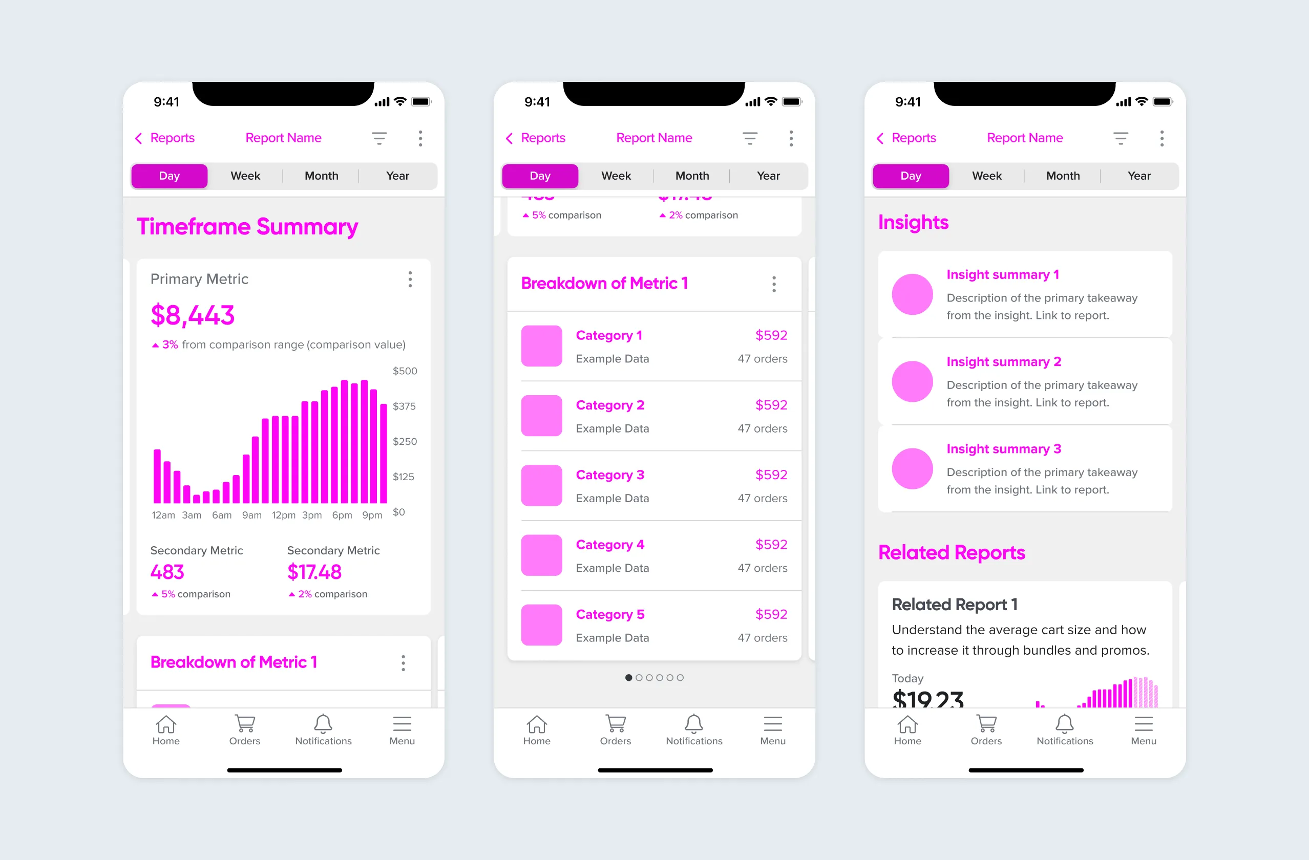 I lead a workshop with the Head of Product and Product Manager to define the primary tasks and information that businesses would find critical using on the go in a mobile app. We defined Reports, Orders, Inventory Management, and Notifications all to be the main critical areas.