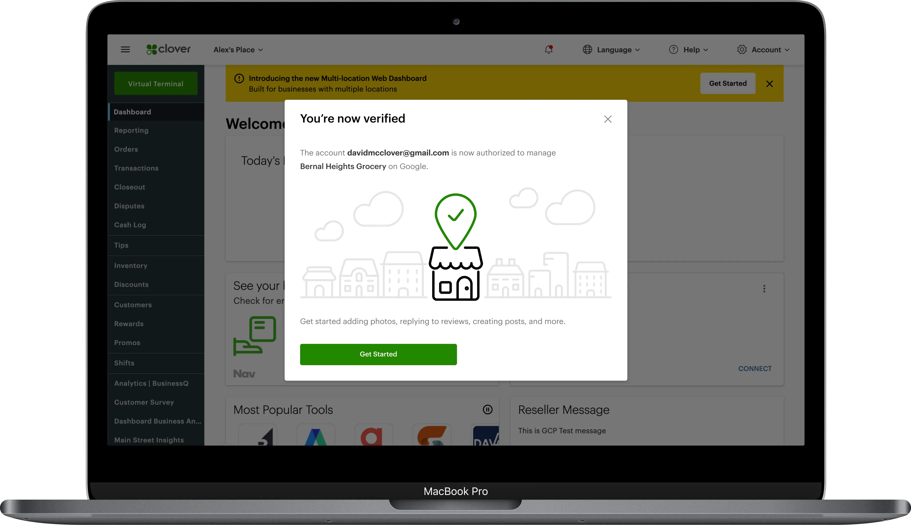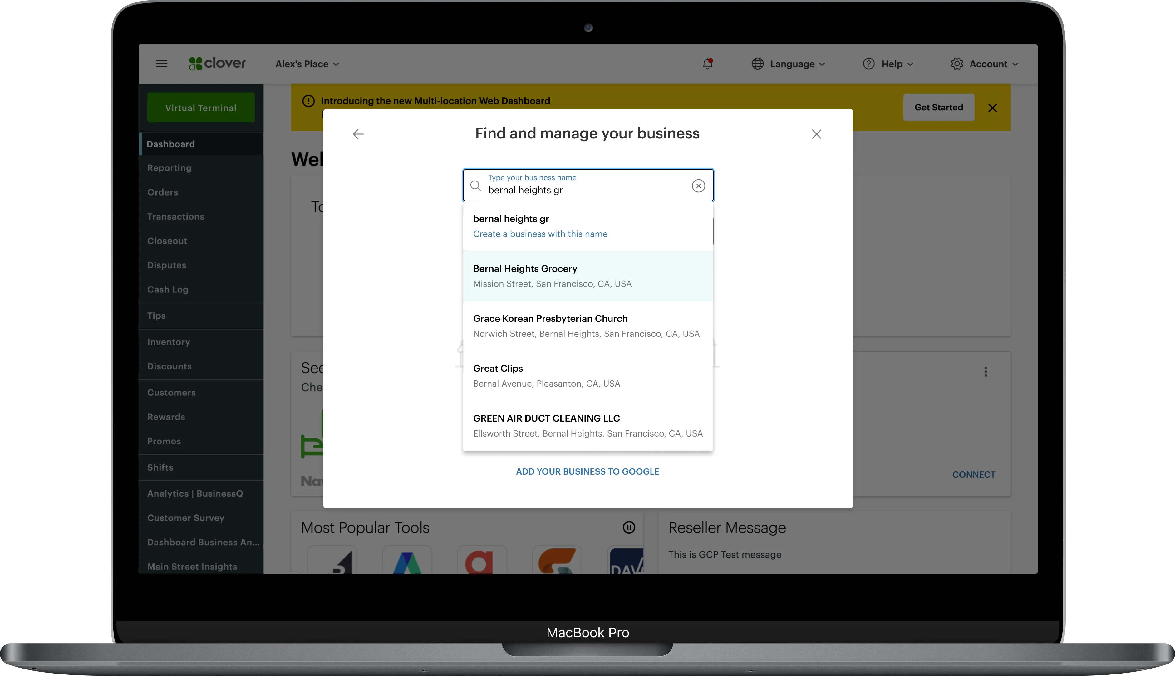 Merchants on the Clover platform looking to integrate an existing Google My Business account or create a new one if one doesn’t exist for their business and manage the information from their dashboard.